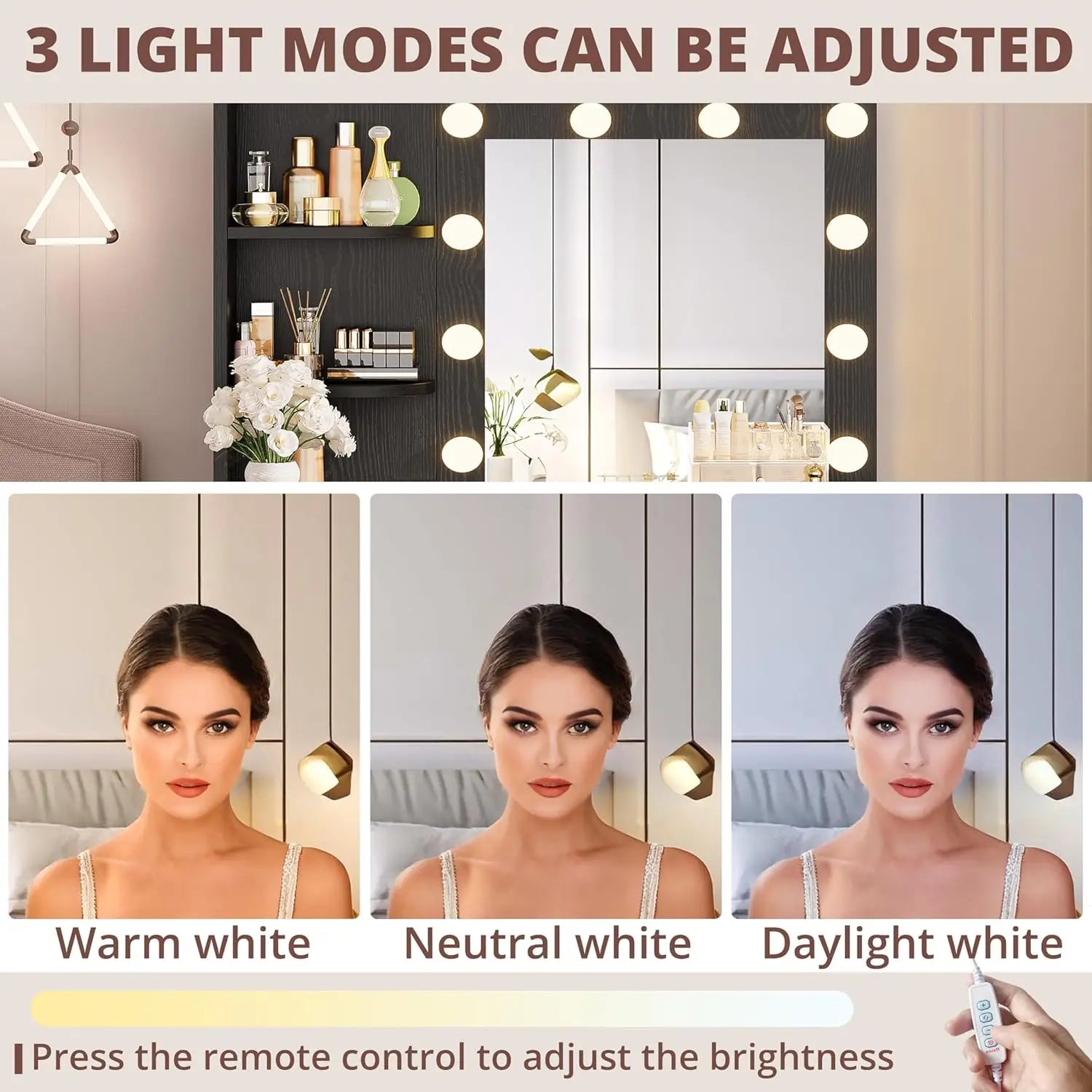 3 LIGHTING & BRIGHTNESS ADJUSTABLE: Comes with a mirror and 10 LED bulbs for the vanity desk. The brightness of the lights is adjustable with 3 colors to choose from: warm yellow, warm white and cool white, so that you can choose different light colors for different scenes and different make-up