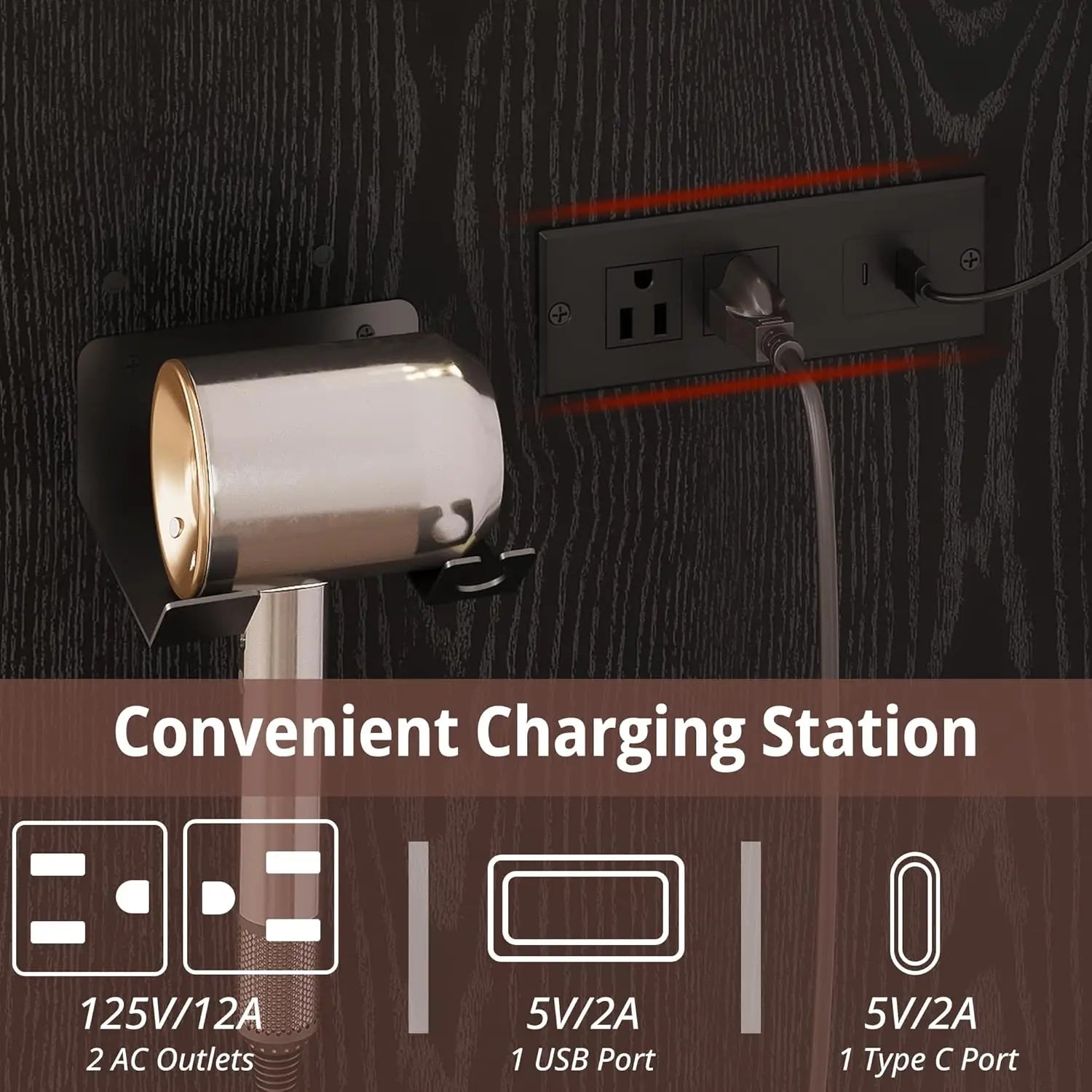 FUNCTIONAL DRESSING TABLE: This makeup vanity has a built-in charging station on the right tabletop, including 2 AC outlets,1USB and 1Type C port, it is very easy for you to charge your electronics in time. In addition, our small vanity desk provides you with a hair dryer rack to keep your hair dryer and hair curler within arm’s reach
